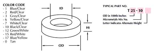 OD = .500 in / 12.7 mm +/- 0.02 in ID = .303 in / 7.70 mm +/- 0.02 in Ht = .190 in / 4.83 mm +/- 0.02 in | | AL=4.9 +/- 5 % uH=(AL*Turns2)/1000 | | Temperature Stability (ppm /°C) = 95 | | Color Code = Red / Clear | Optimum Resonant Circuit Range for highest Q and lowest core loss 250 KHz - 10 MHz | Orders and Pricing www.kitsandparts.com |